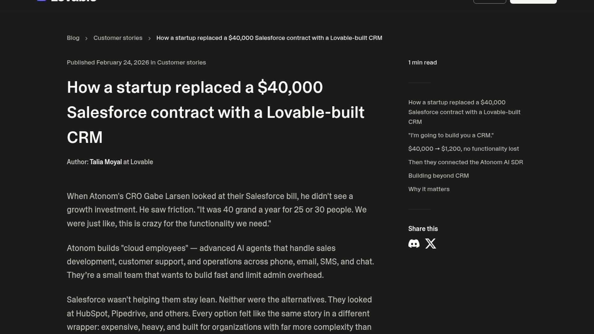 Atonom says it replaced a $40,000-a-year Salesforce setup with a custom CRM built on Lovable in roughly three hours and now runs it for about $1,200 annually including hosting. The bigger story is not just cost savings: owning the code let the startup wire the CRM directly into its AI sales agent and internal workflows.