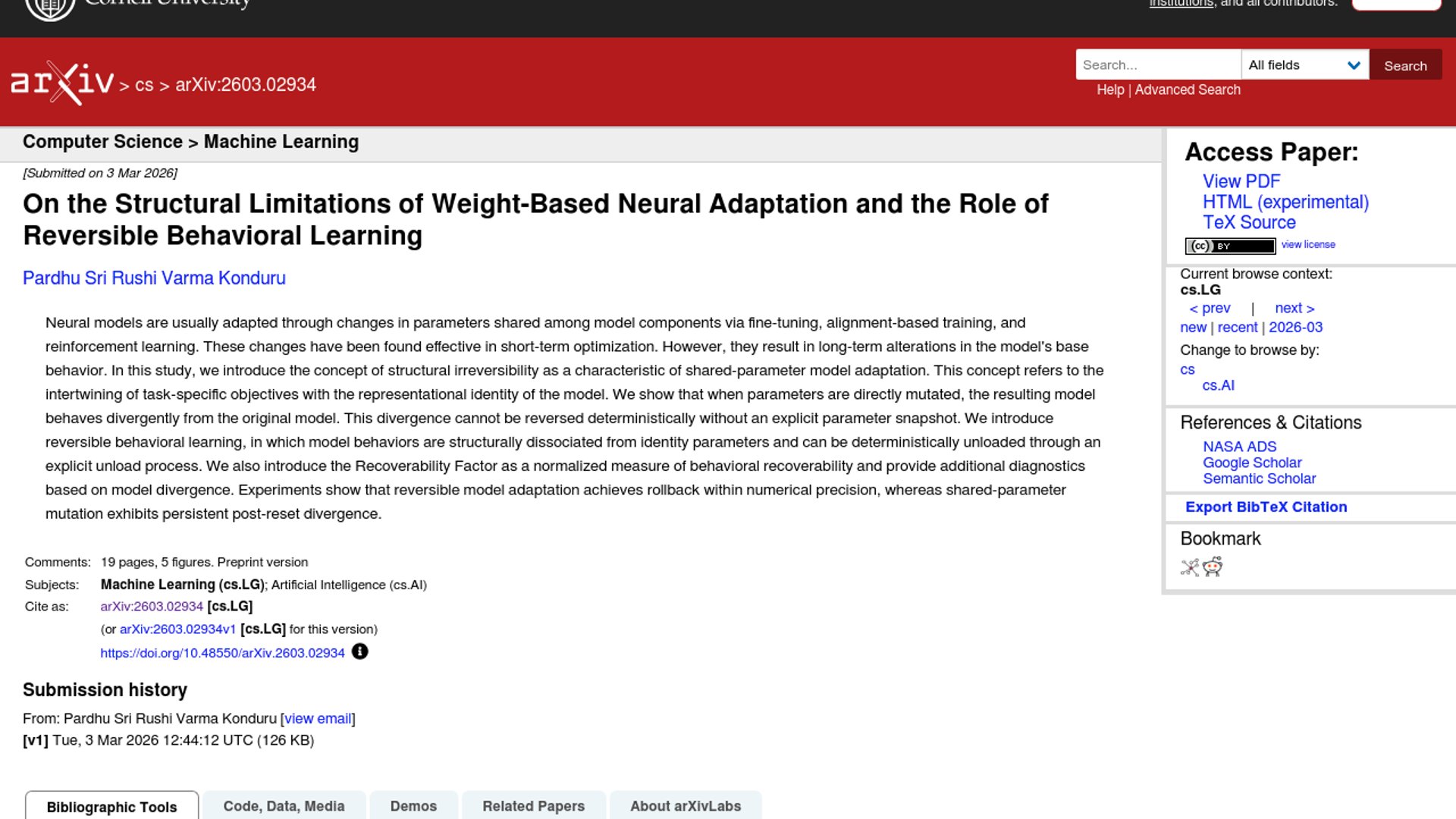 A March 2026 arXiv preprint argues that standard weight-updating adaptation is structurally hard to reverse, even after reset attempts, and introduces “Reversible Behavioral Learning” as an alternative. The paper reports near-exact rollback in its reversible setup and proposes new diagnostics like a Recoverability Factor for measuring behavioral recoverability.
