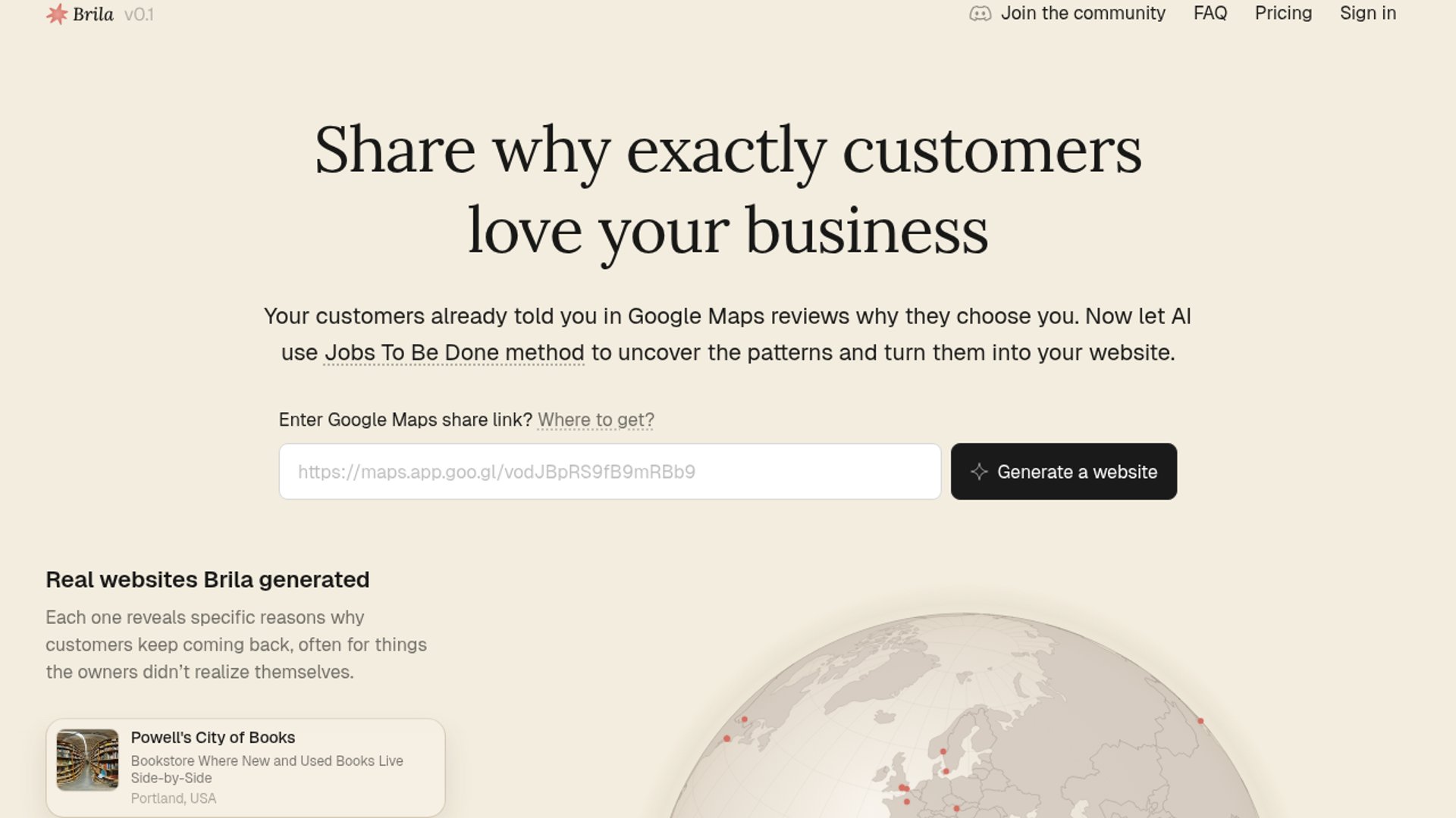 Brila is an AI website builder for local businesses that reads Google Maps reviews and turns the patterns into a one-page site with copy, structure, and visuals grounded in customer language. It leans on Jobs To Be Done framing to surface why people actually choose a business, then packages that into a launch-ready homepage.