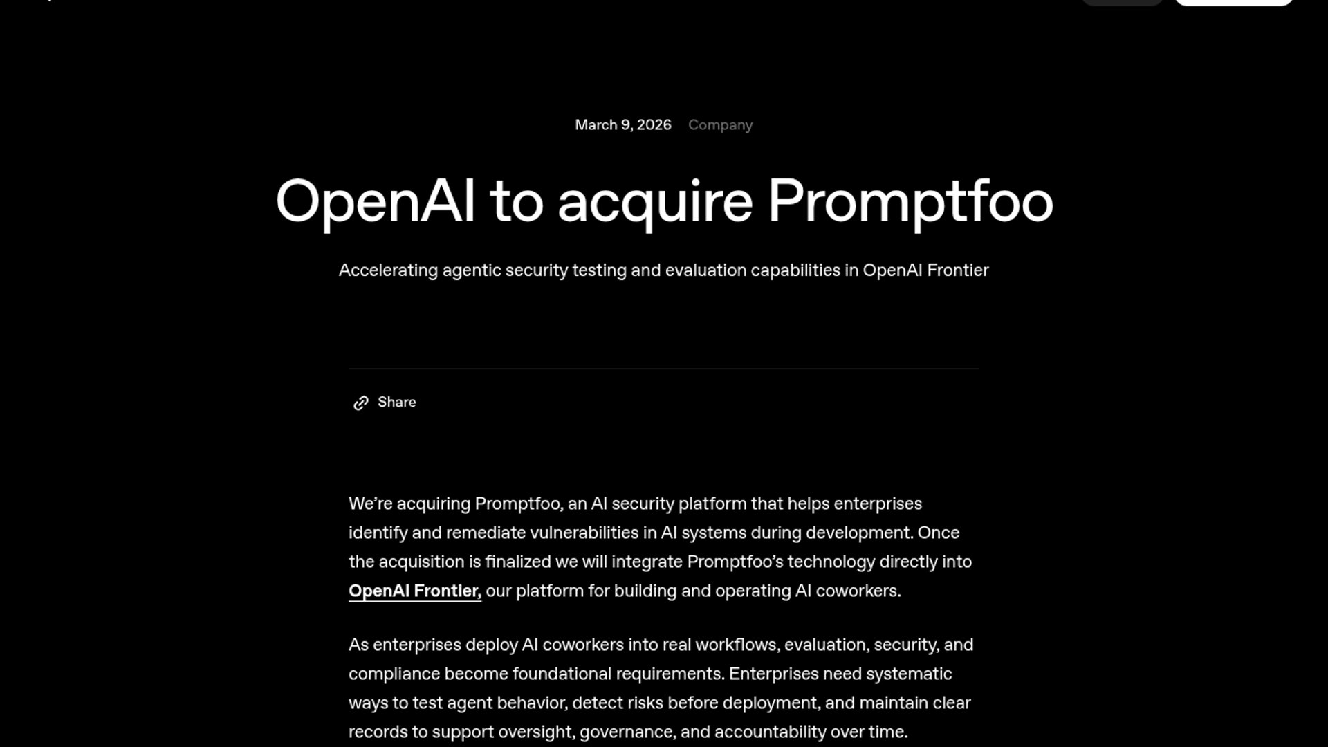 OpenAI is acquiring Promptfoo, the AI security platform behind a widely used open-source CLI for red-teaming and evaluating LLM applications. Once the deal closes, Promptfoo’s security, testing, and remediation capabilities will be integrated into OpenAI Frontier, the company’s enterprise platform for building and operating AI coworkers.