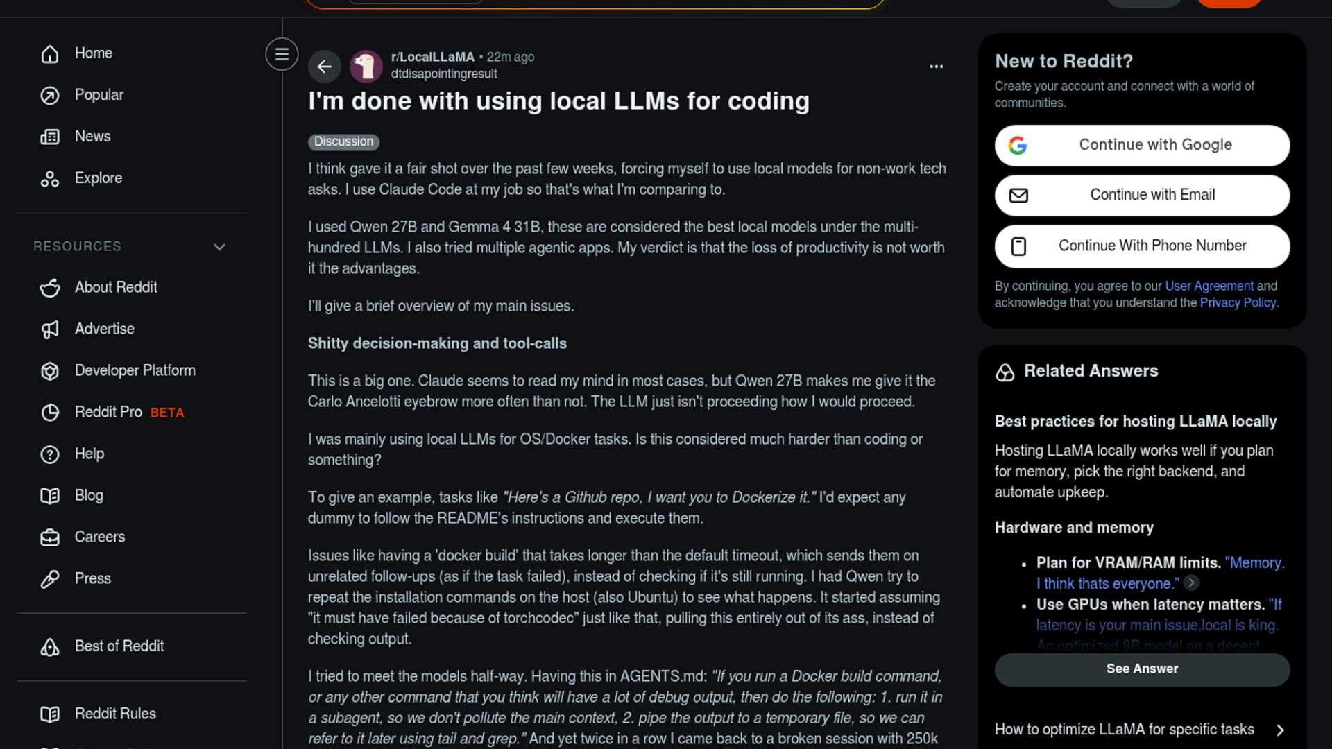 A veteran developer's experiment with local LLMs for coding ends in frustration after Qwen 27B and Gemma 4 31B fail to match the reliability of Claude Code. Citing "shitty decision-making," broken prompt caches, and a massive "productivity tax" during Docker and OS tasks, the user is pivoting back to frontier cloud models like Kimi and Claude for professional software engineering.