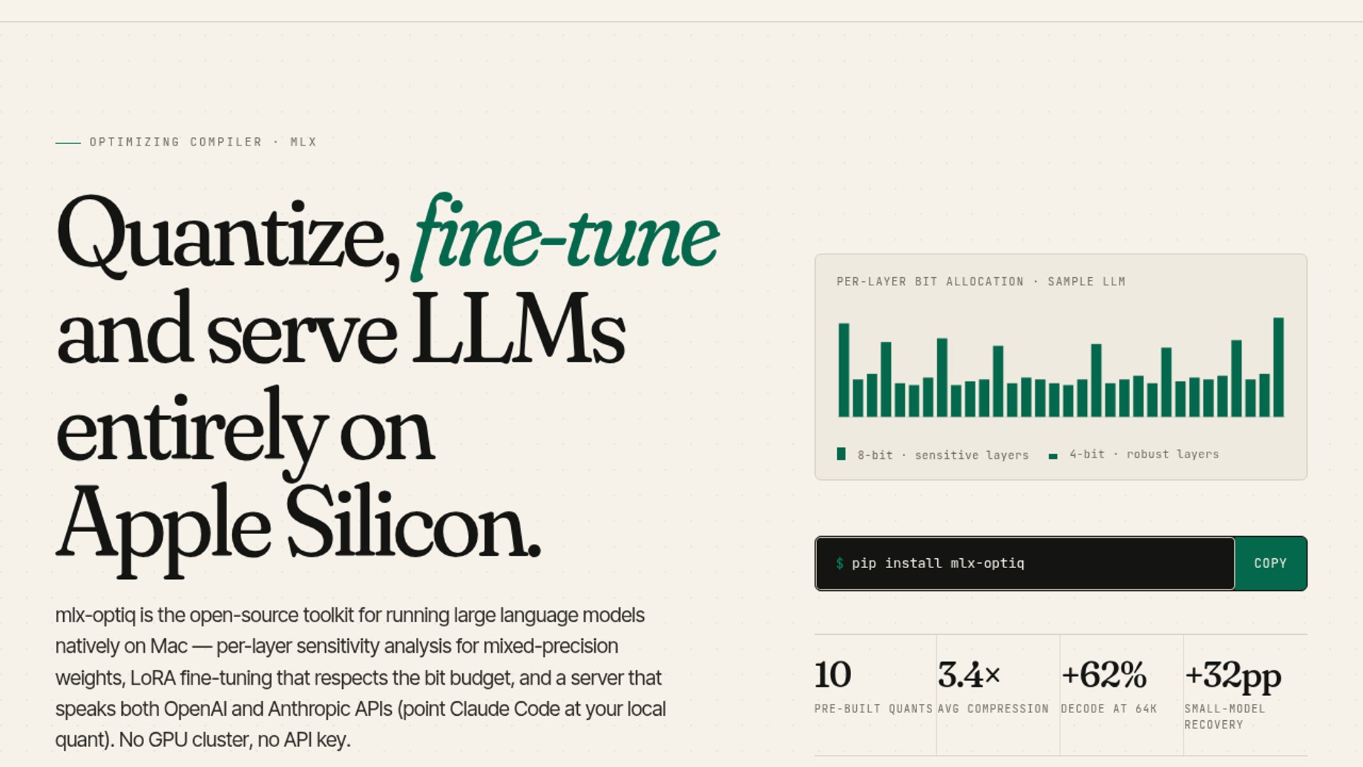 - –`mlx-optiq` has a real package and docs footprint, which is a strong legitimacy signal.