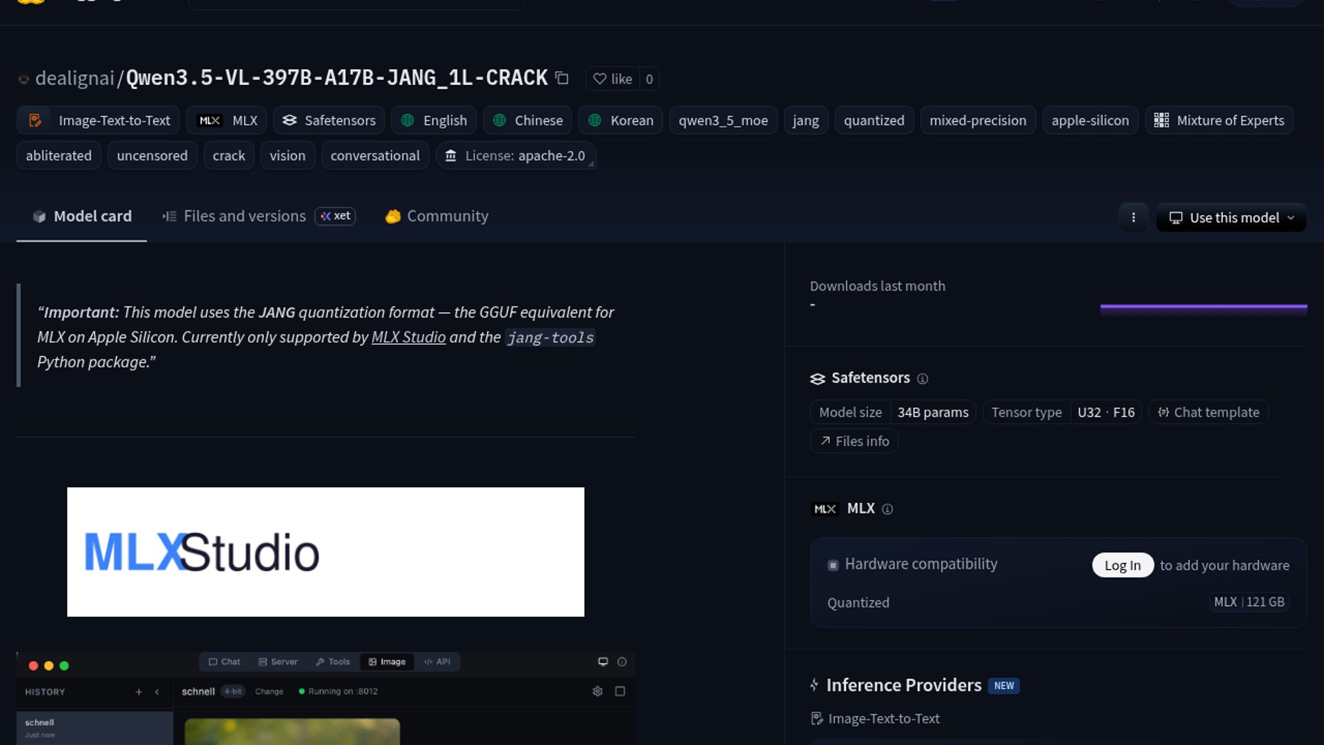 This JANG-based, Apple Silicon-focused uncensored variant of Qwen3.5-VL-397B-A17B claims 88.9% MMLU on 112 GB Macs. It runs through MLX Studio and is aimed at squeezing a 397B MoE model onto high-memory Mac hardware.