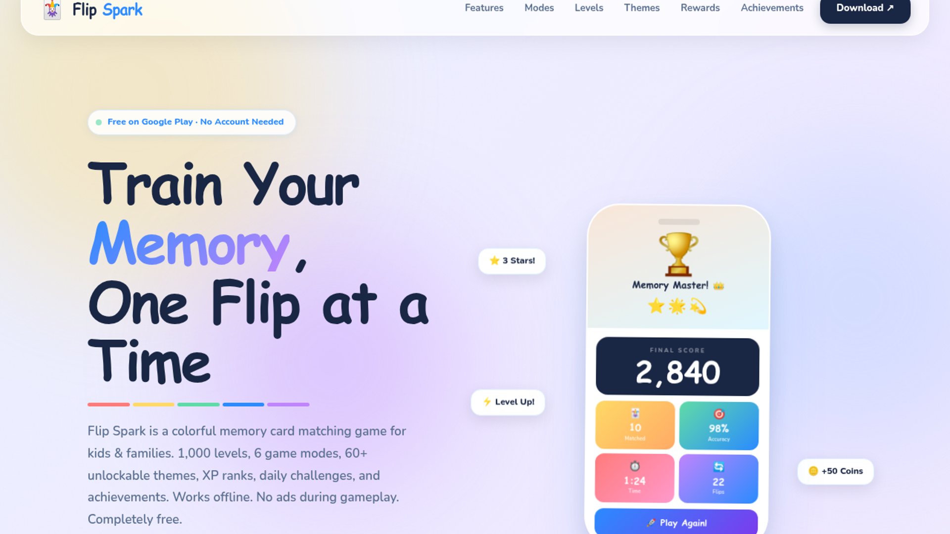 Flip Spark is a colorful memory card-matching game for kids and families. It adds 1,000 levels, 6 game modes, 60+ unlockable card themes, XP ranks, daily challenges, achievements, offline play, and no ads during gameplay on Android.