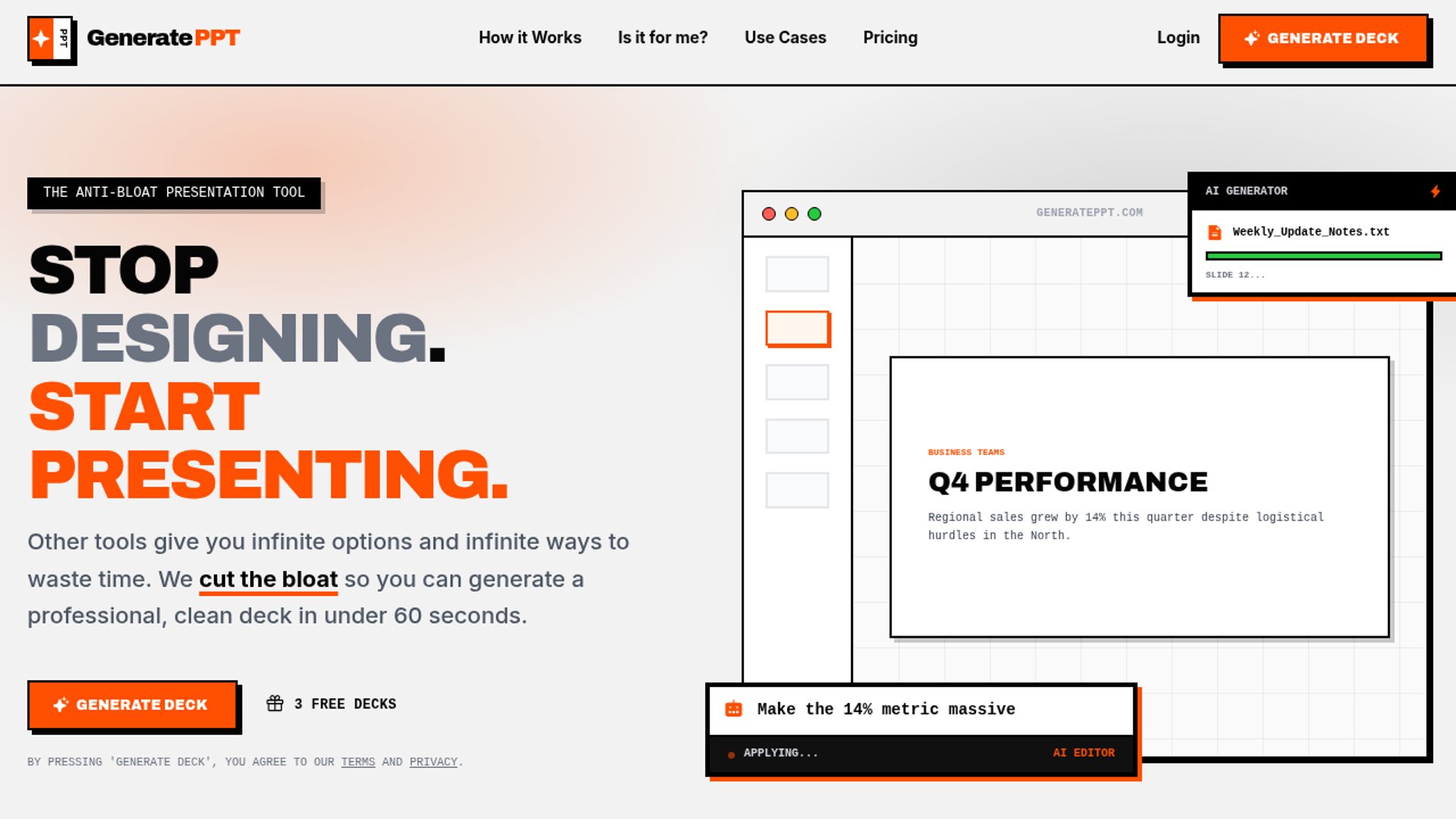 The product leans hard into a real pain point: most slide tools give users too much freedom and too much busywork. That makes GeneratePPT interesting not because it promises perfect design, but because it explicitly optimizes for momentum.
