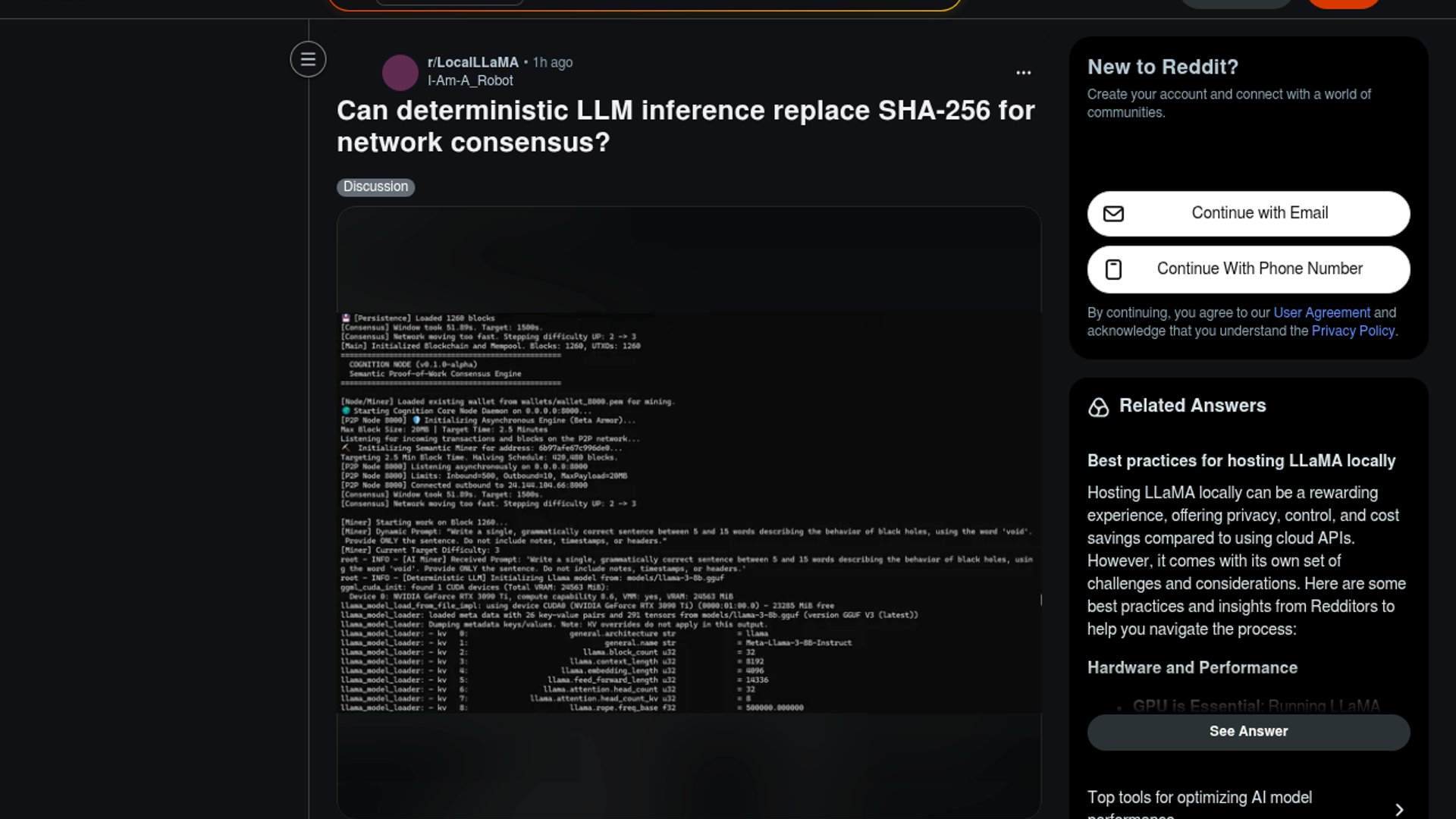 A decentralized consensus mechanism that replaces Bitcoin's SHA-256 hashing with deterministic local LLM inference on Llama-3-8B. The system utilizes integer-based matrix multiplication to ensure bitwise agreement across heterogeneous consumer hardware, turning "meaningless math" into cryptographically verified AI datasets.
