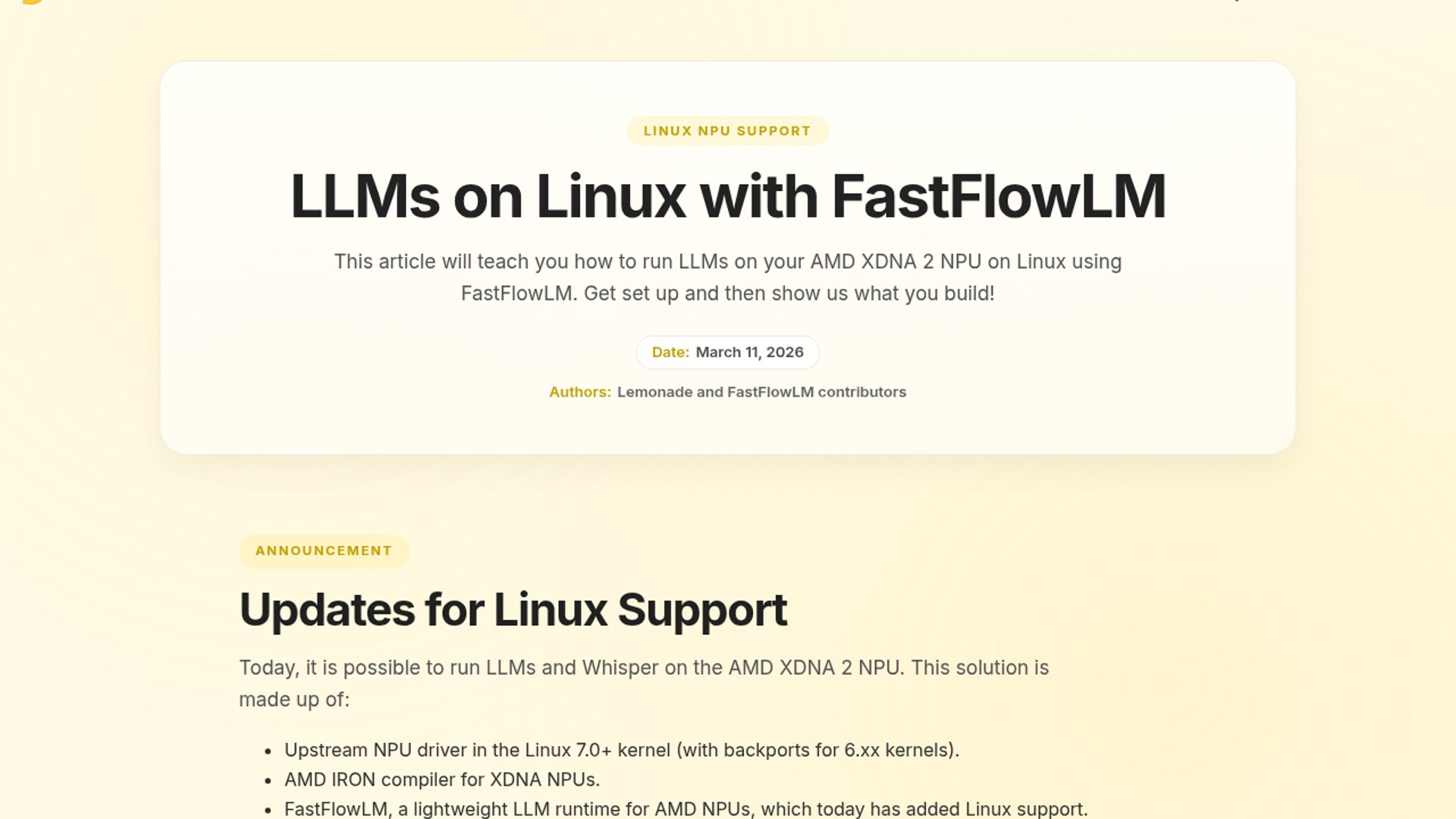 FastFlowLM has added Linux support for running LLMs directly on AMD XDNA 2 NPUs, with Lemonade Server publishing a March 11 guide that ties together the kernel driver, AMD IRON compiler, FLM runtime, and local server stack. For Ryzen AI 300/400-series Linux users, this turns AMD’s NPU story from a Windows-only curiosity into a real local inference option.