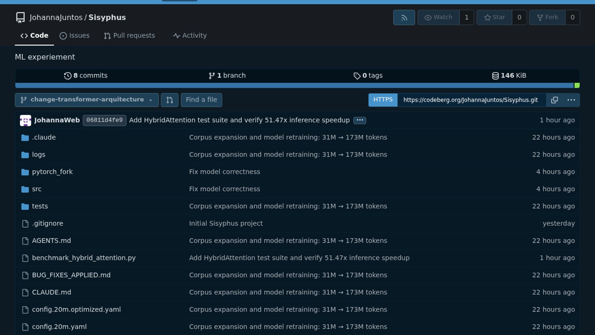 Sisyphus is a byte-level Rust-focused language model trained from scratch in PyTorch on a 173.5M-byte corpus, using a custom HybridAttention block instead of standard full attention. The project reports 25.6M parameters, 2.15 perplexity, and a 51.47x inference speedup with cache paging on a single RTX 4060 Ti.