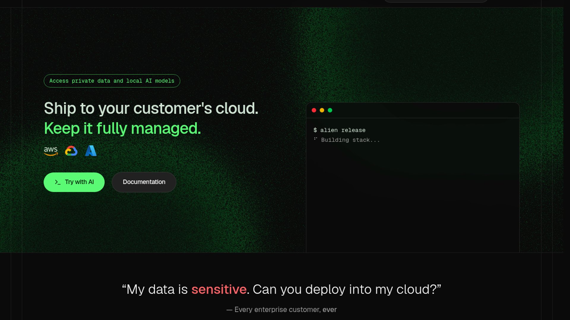 Alien lets vendors deploy software into customers’ AWS, GCP, or Azure accounts while keeping updates, monitoring, and debugging centralized. It’s aimed at enterprise self-hosting where the customer wants data locality, but the vendor still needs real operational control.
