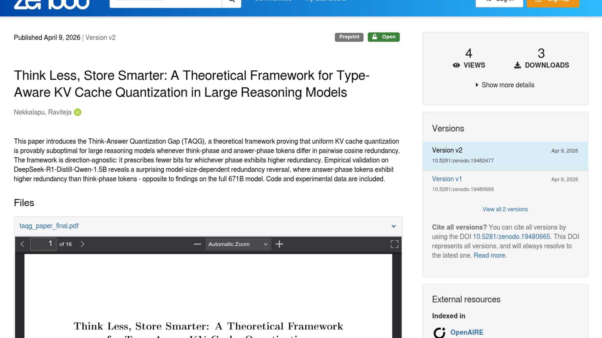 This open-access paper reports KV-cache redundancy measurements on DeepSeek-R1-Distill-1.5B and finds that answer tokens are more redundant than think tokens, which cuts against the usual assumption that reasoning traces and answers should be treated uniformly for cache quantization. The authors argue this has direct implications for KV-cache compression policy and provide code and data on Zenodo for reproduction and follow-up work: https://doi.org/10.5281/zenodo.19482477