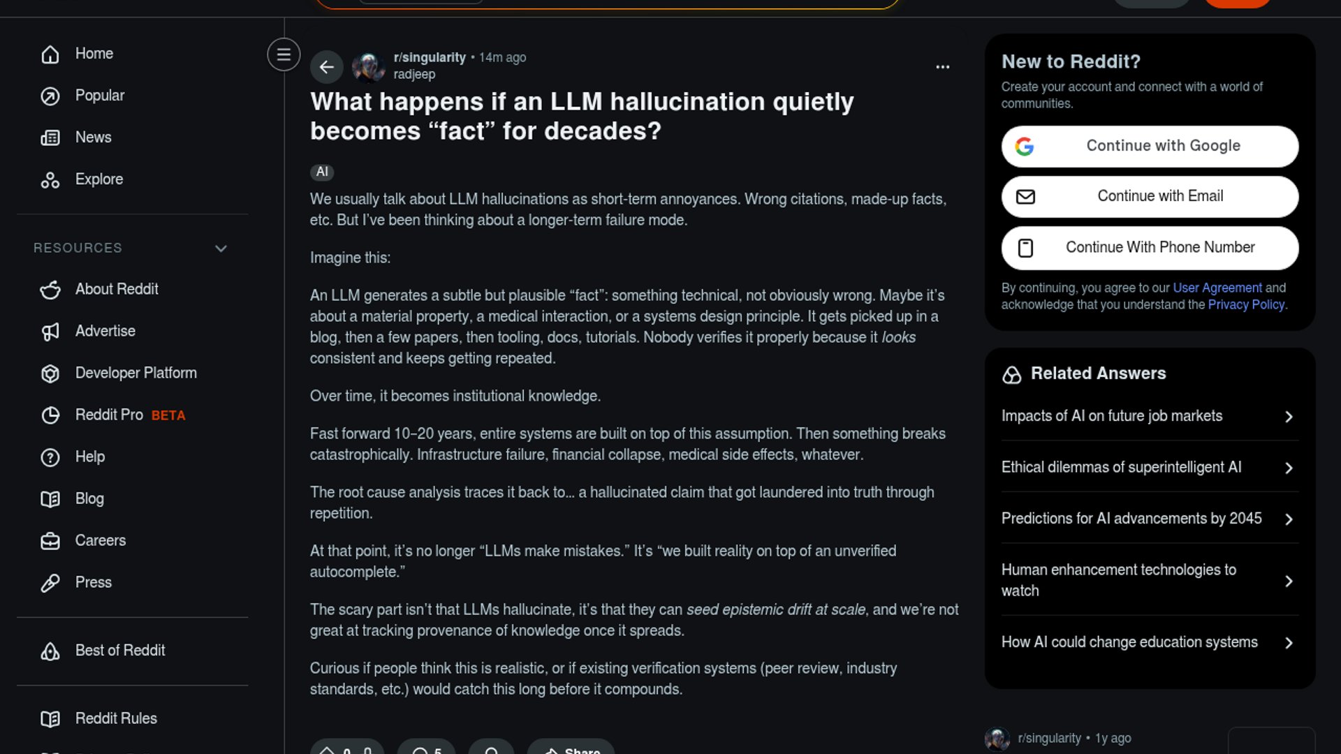 The post argues that a plausible but wrong LLM-generated claim could get copied through blogs, papers, docs, and tooling until it hardens into “common knowledge.” The real risk is less a single bad answer than long-lived provenance failure.
