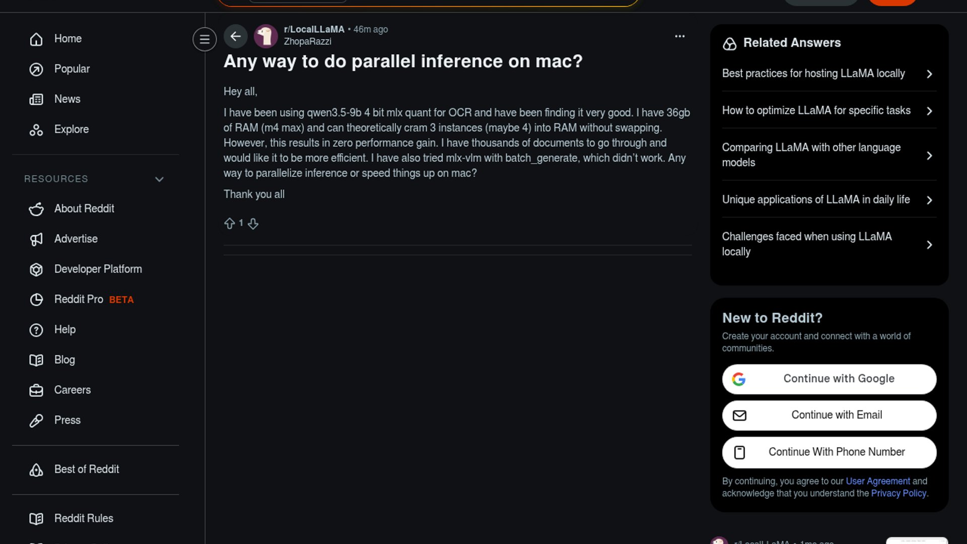 A LocalLLaMA user says Qwen3.5 Small's 9B 4-bit MLX quant is excellent for OCR, but running three or four copies on an M4 Max with 36GB RAM does not improve throughput. They are looking for a real batching or parallelization path on macOS after mlx-vlm's batch_generate failed to help.