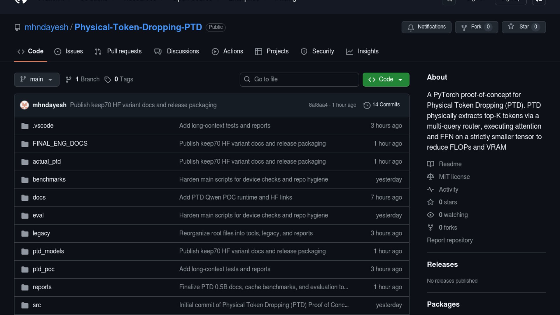 Physical Token Dropping is a new open-source sparse transformer proof-of-concept that physically drops low-scored token segments during block execution, shipping with code and a Hugging Face Qwen2.5-0.5B keep-70 variant. The reported tradeoff is notable for long-context inference: up to 72.11% lower latency and 85.56% lower peak VRAM at 8K context, with modest quality loss on this small model.