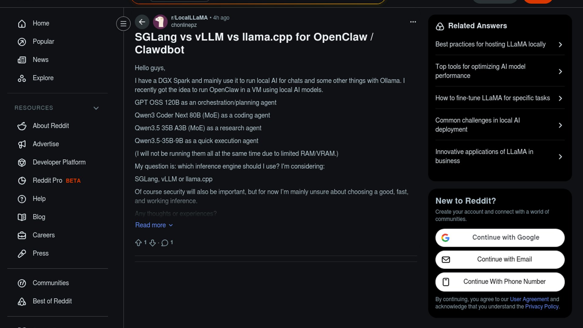 A Reddit thread from the LocalLLaMA community asks which inference engine—SGLang, vLLM, or llama.cpp—is the best fit for running OpenClaw locally on a DGX Spark with large specialist models. The discussion is less about OpenClaw itself than about the practical infrastructure tradeoffs behind self-hosted agent deployments: throughput, model support, memory efficiency, and operational safety.