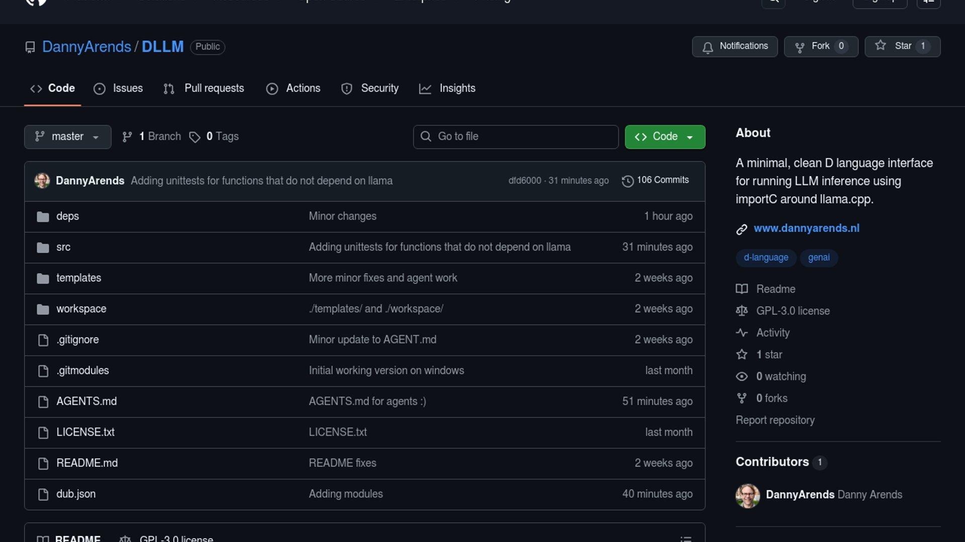 - –The [GitHub repo](https://github.com/DannyArends/DLLM) frames DLLM as a D-language agent built directly on llama.cpp via importC, while the [Reddit post](https://www.reddit.com/r/LocalLLaMA/comments/1s2jgz5/dllm_a_minimal_d_language_interface_for_running/) highlights the three-model pipeline and tool system.