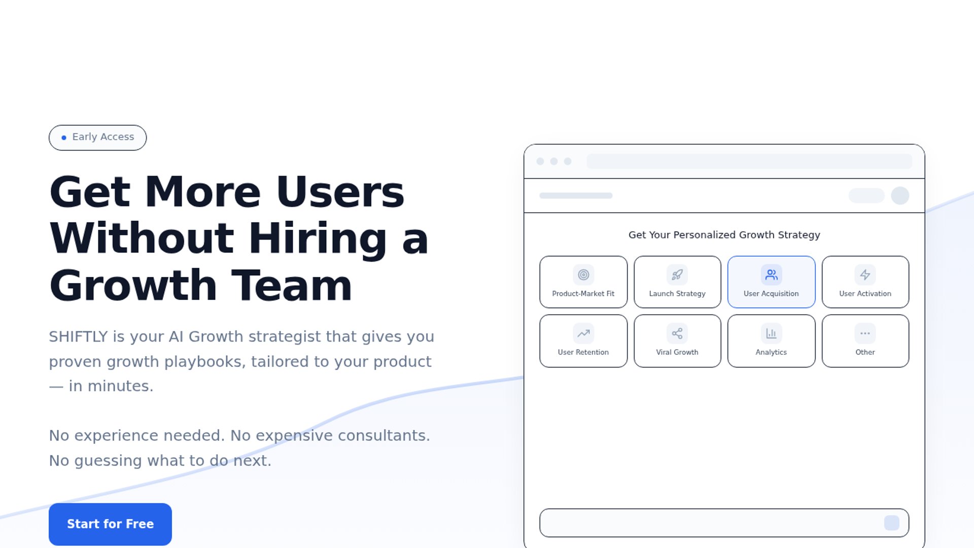 SHIFTLY is an early-access AI growth strategist for founders, indie hackers, and small teams, turning product context into tailored acquisition, launch, activation, retention, and viral-growth playbooks. It also exposes a paid Growth API for AI agents using USDC on Base via x402.
