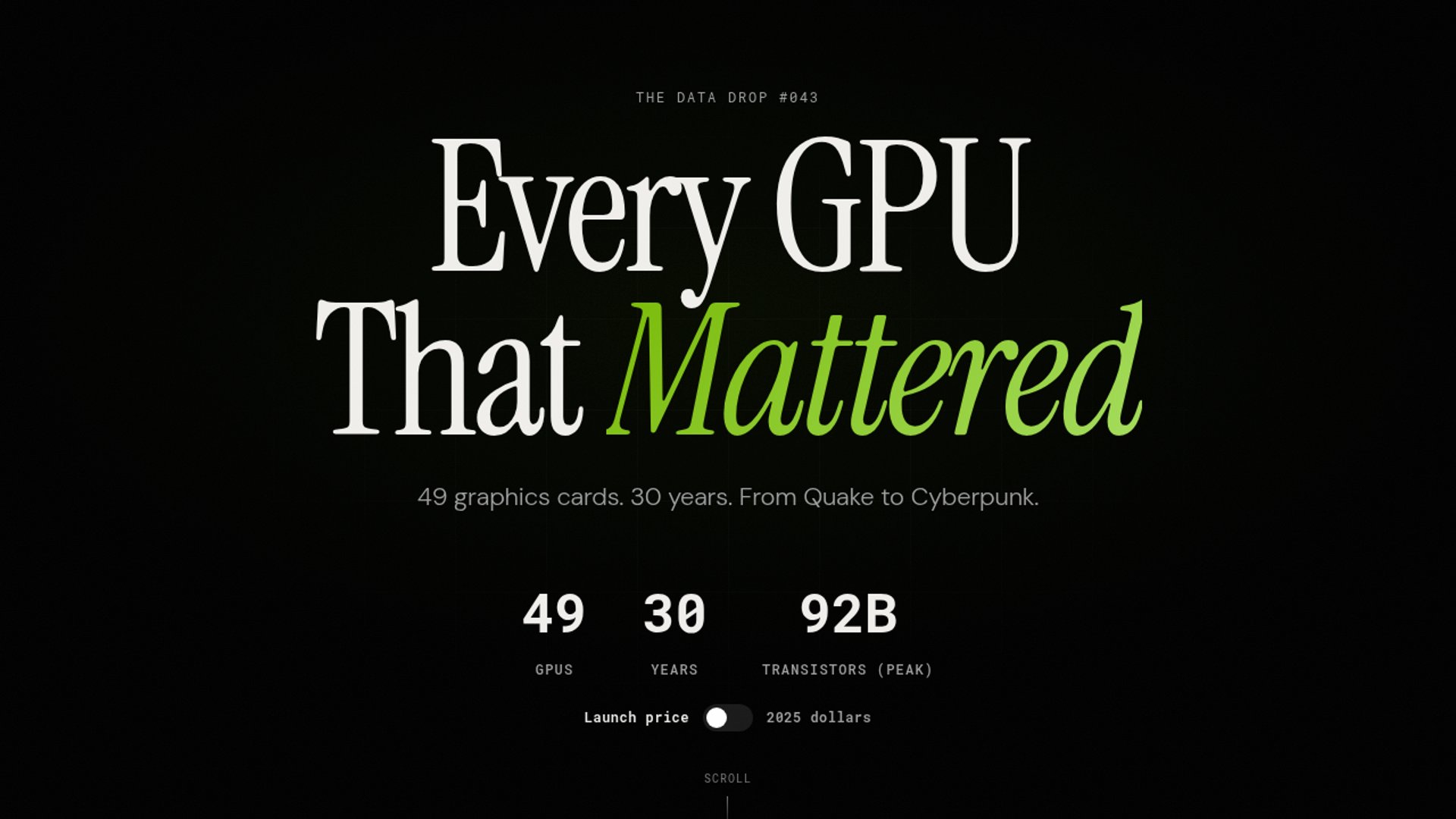 Every GPU That Mattered is an interactive data story from sheets.works that charts 49 graphics cards across 30 years, normalizing launch prices to 2025 dollars and pairing hardware milestones with a timeline, side-by-side comparisons, and an evolution view. It also grounds the nostalgia in current usage data with a Steam Hardware Survey snapshot, making the piece read like both a history lesson and a market reality check for PC hardware.