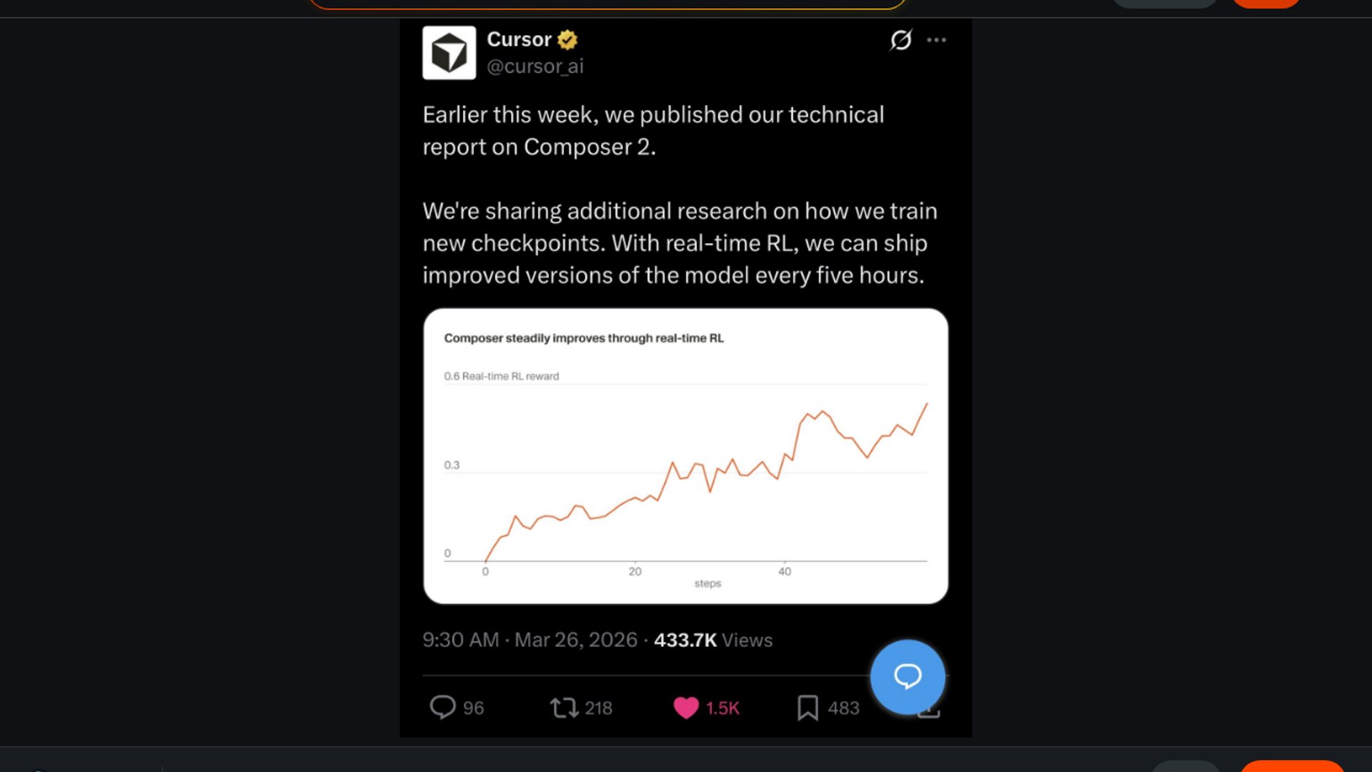 Cursor’s real-time RL loop turns live production interactions into fresh Composer checkpoints about every five hours, using user feedback and evals to ship incremental model improvements quickly. The bet is that on-policy training from real coding sessions will outpace benchmark-only tuning, even if the usual reward-hacking risks remain.