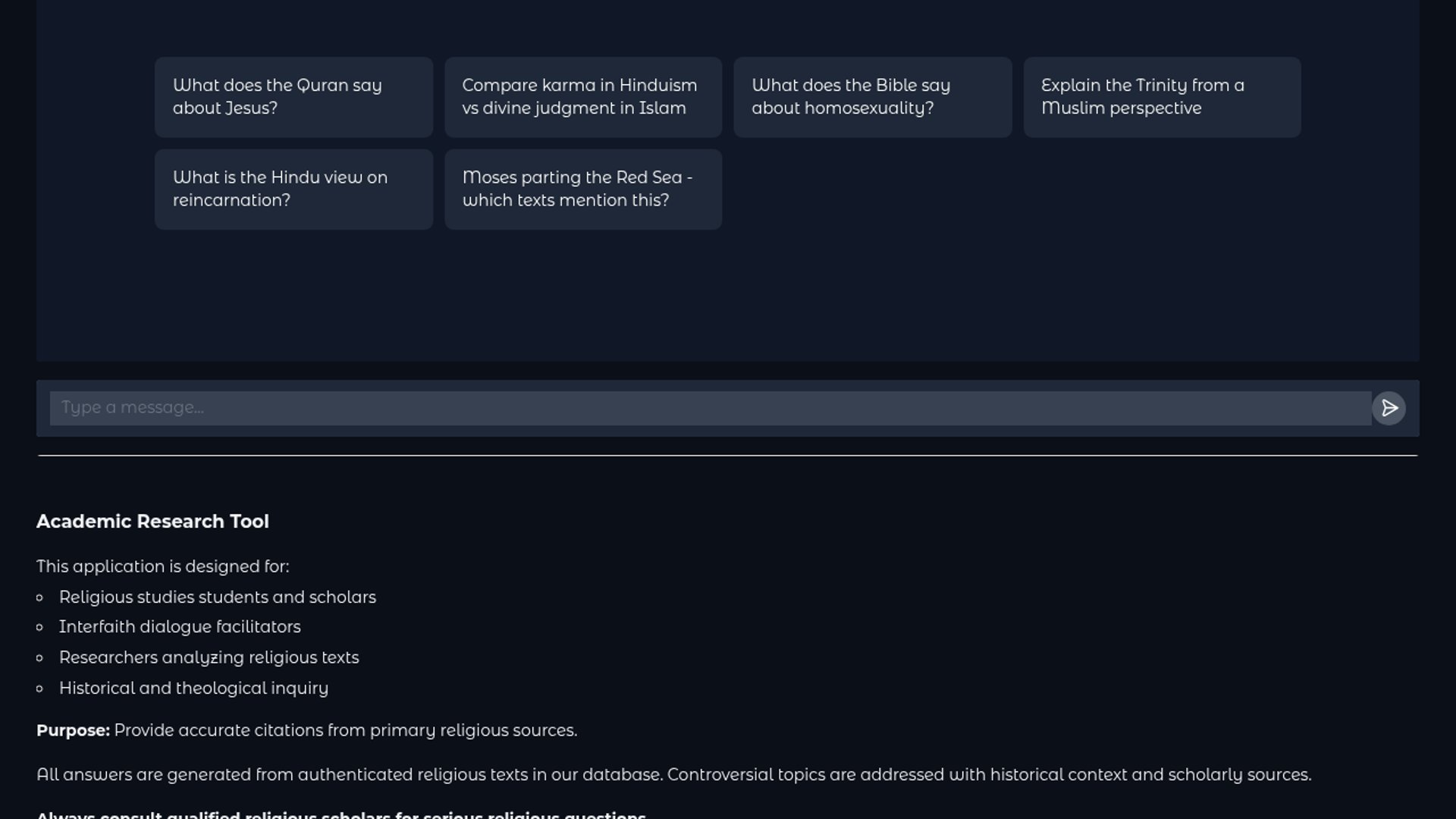 A specialized RAG system indexing 165,000 documents across Islam, Christianity, and other traditions using BGE-large and Llama 3.3. It implements name normalization and source diversity tuning to ensure precise, cross-tradition citations while enforcing strict, citation-only synthesis.