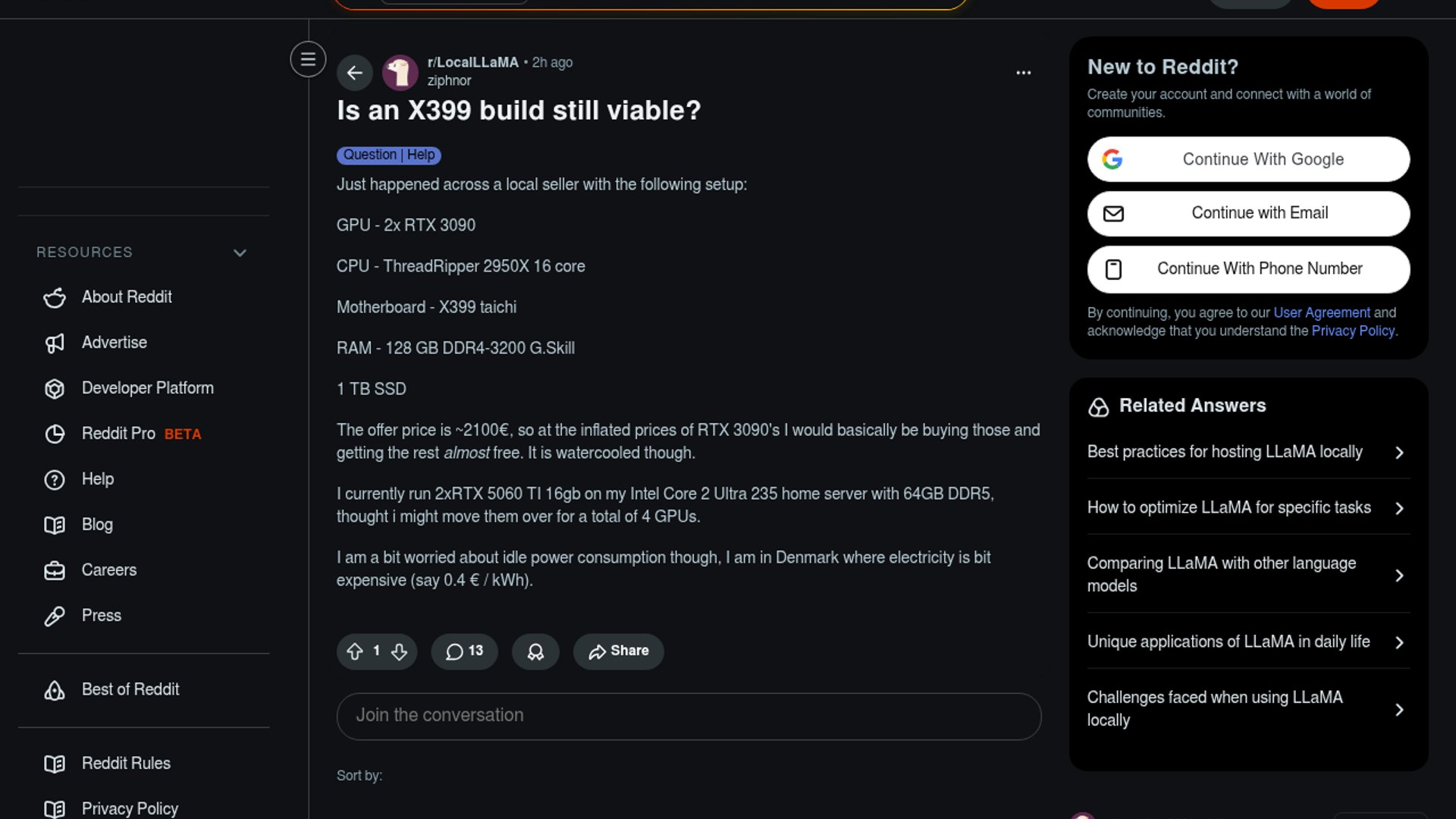 A Reddit user is evaluating whether an older X399 Threadripper build with two RTX 3090s, 128 GB of RAM, and water cooling is still worth buying for local AI workloads. The asking price is about 2100€, which makes the GPUs the main value driver, but the poster is concerned about whether the platform can handle a 4-GPU setup and whether the idle power draw will be too expensive in Denmark.