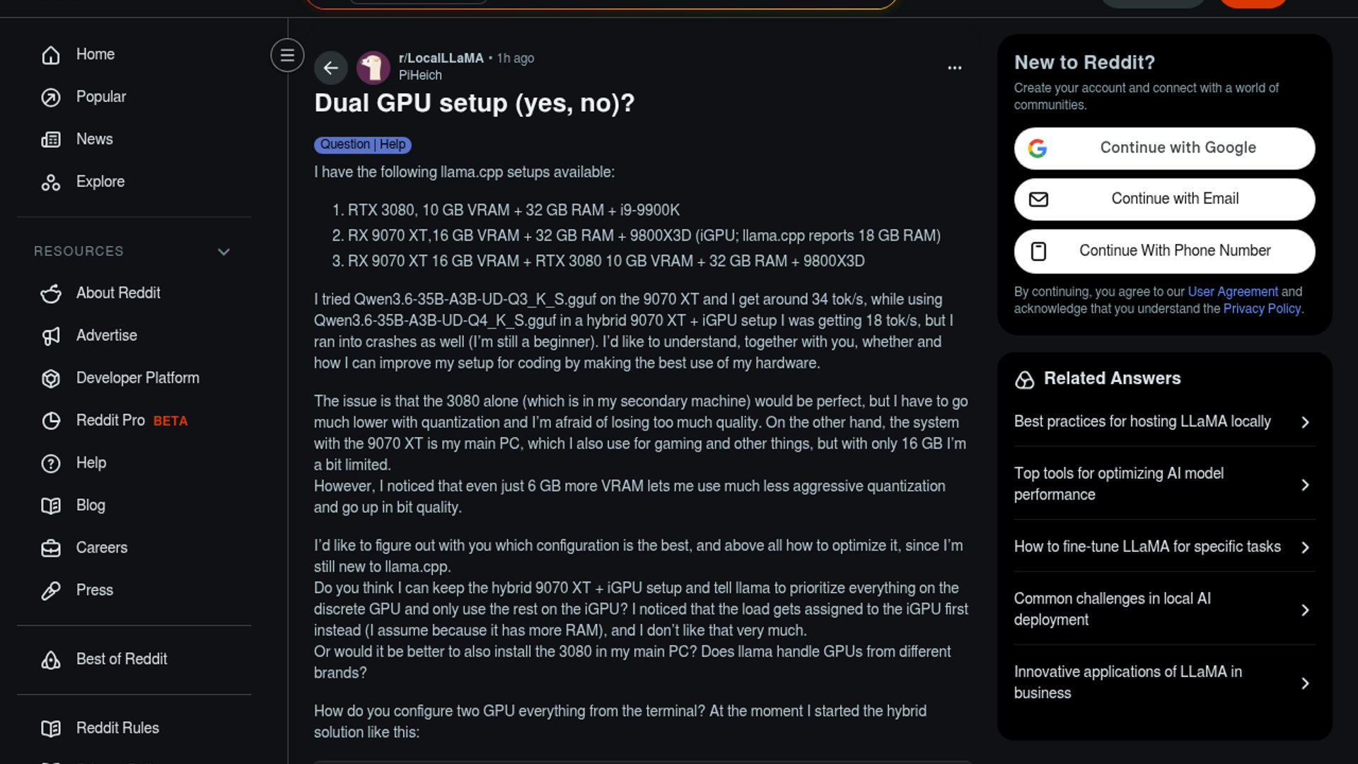 - –The thread reflects a real tradeoff for local coding models: the RX 9070 XT gives better single-card headroom than the 3080, but the 3080 can unlock higher quants if it is the only or primary inference GPU.