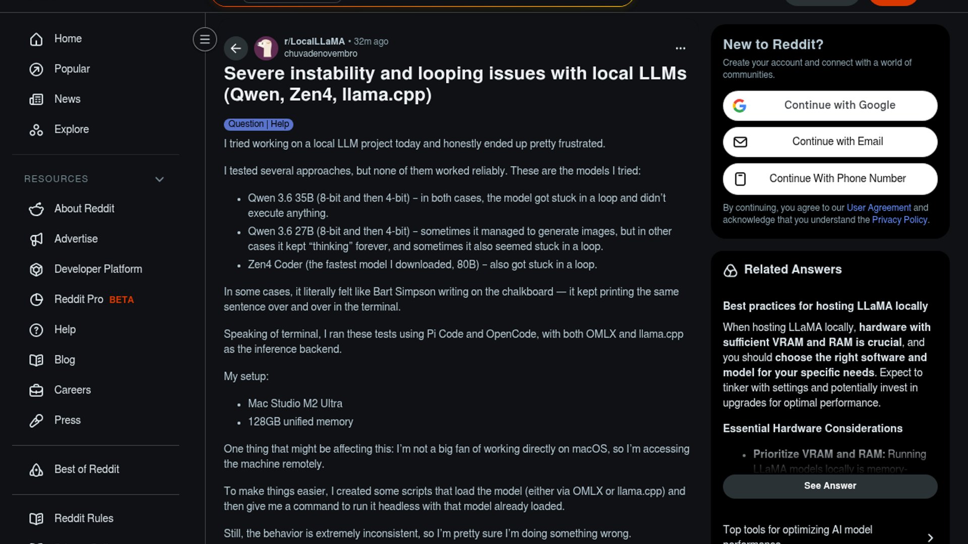 A LocalLLaMA user says large Qwen and Zen4 Coder models repeatedly loop or hang when run through Pi Code and OpenCode on a Mac Studio M2 Ultra, using llama.cpp or OMLX as the backend. They suspect the issue is in their runtime setup and are asking how to make llama.cpp more stable.