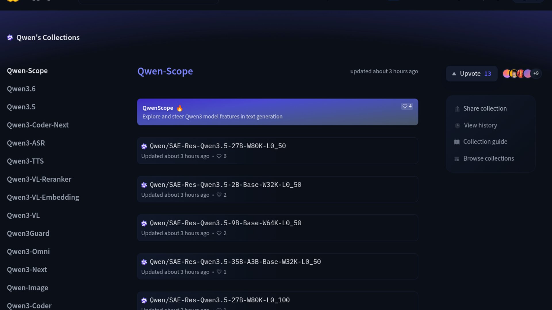 Qwen Team released Qwen-Scope, a public SAE suite for Qwen 3.5 models spanning 2B through 35B MoE, plus a Hugging Face Space for feature exploration and steering. It exposes residual-stream features across layers, turning model internals into something researchers can inspect, localize, and intervene on.