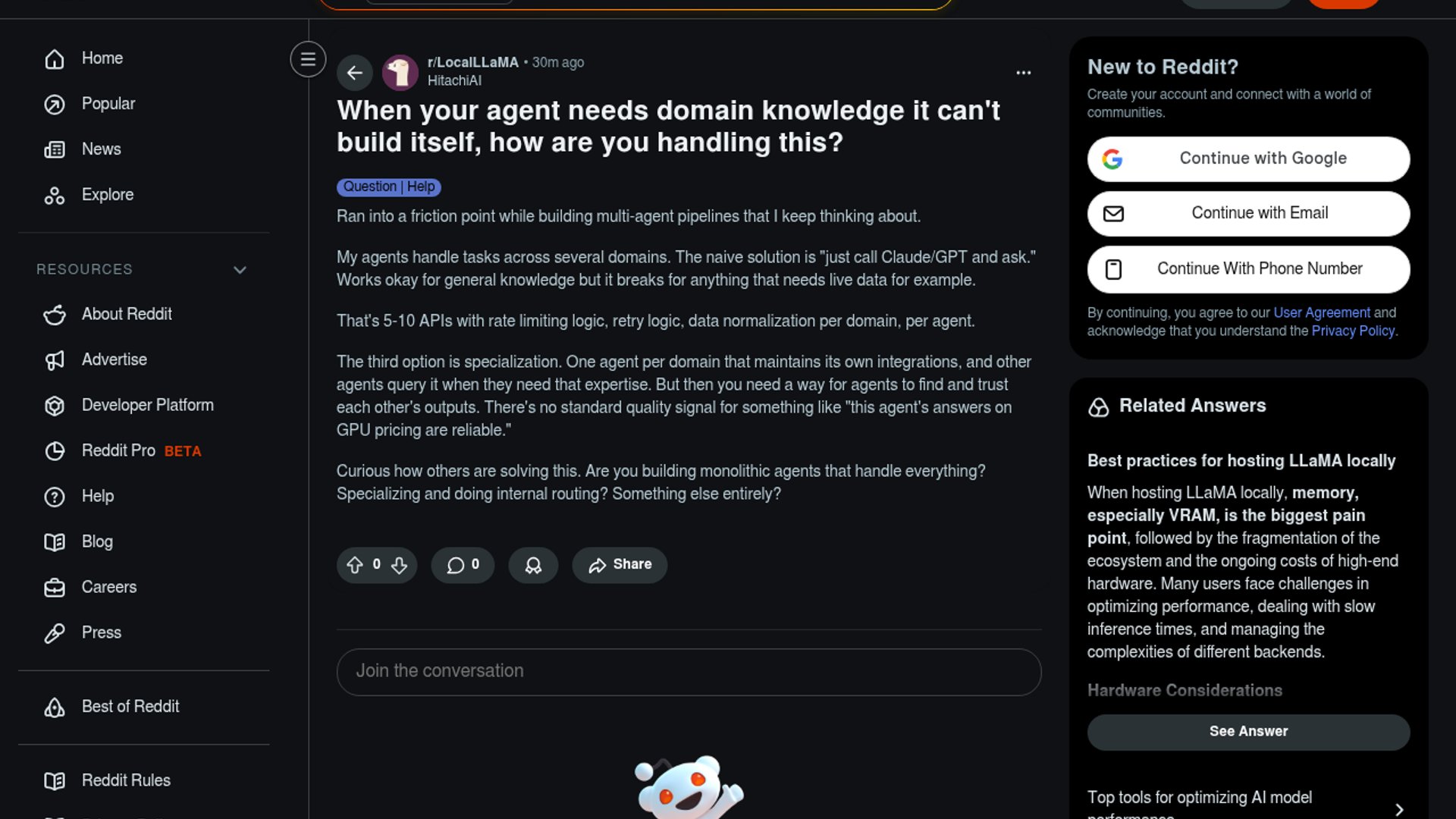 A LocalLLaMA post asks how builders should handle agents that need live, domain-specific knowledge across many APIs without turning every agent into a brittle integration bundle. The core tension is whether to centralize tools in one monolithic agent or route work to specialized domain agents with verifiable outputs.